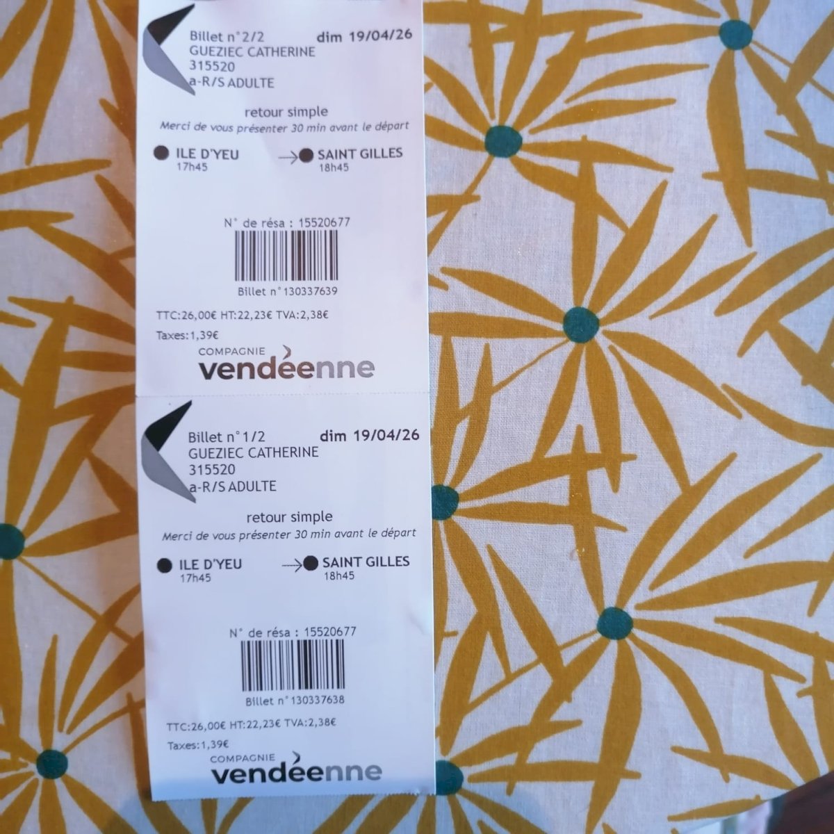 2 Tickets Yeu - St Gilles - APRIL 19, 2026 (5:45pm). Price offered: €45 instead of €52.